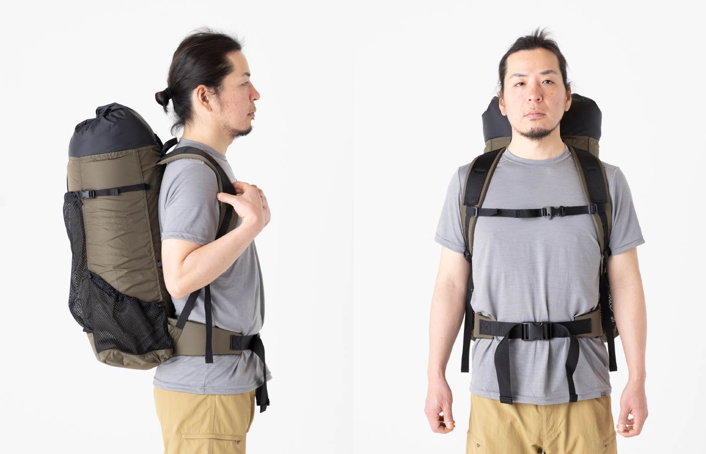 このときにやや胸を張ると背中とバックパックの密着度が上がり安定感が増します。バックパックの軽さと荷物の軽さを最大限に活かして、背中を中心とした上半身全体で荷重を支えます。