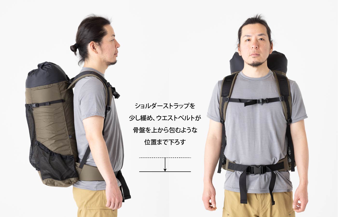 ウエストベルトが骨盤を上から包むような位置まで下ろしたら、骨盤をウエストベルトでしっかりと包みます。いわゆる腰荷重させる背負い方です。