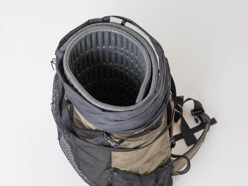 ULバックパックのパッキングにおいて、ロールマットをフレームやパッドの替わりにする方法があります。写真のようにロールマットを筒状にしてバックパックに挿入します。バックパック内で内側に空間をつくるように広げます。こうしてできた中央の空間に荷物をパッキングしていきます。ロールマットが荷物を外から押さえ込んでくれます。また背中のパッド、フレームの替わりにもなります。クラシックスタイルですが、シンプルなULバックパックにおいては今でも最も有効なパッキング方法のひとつで