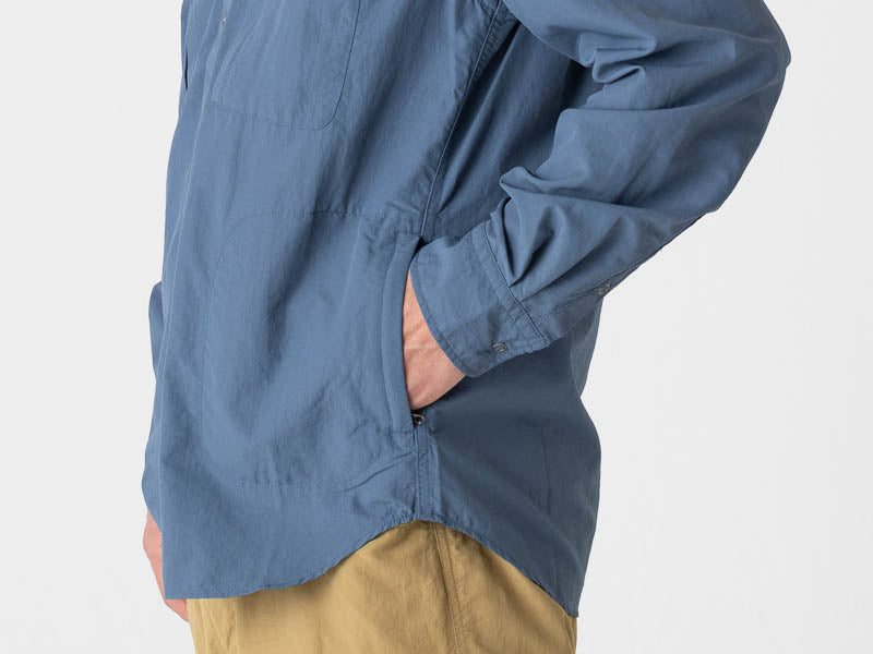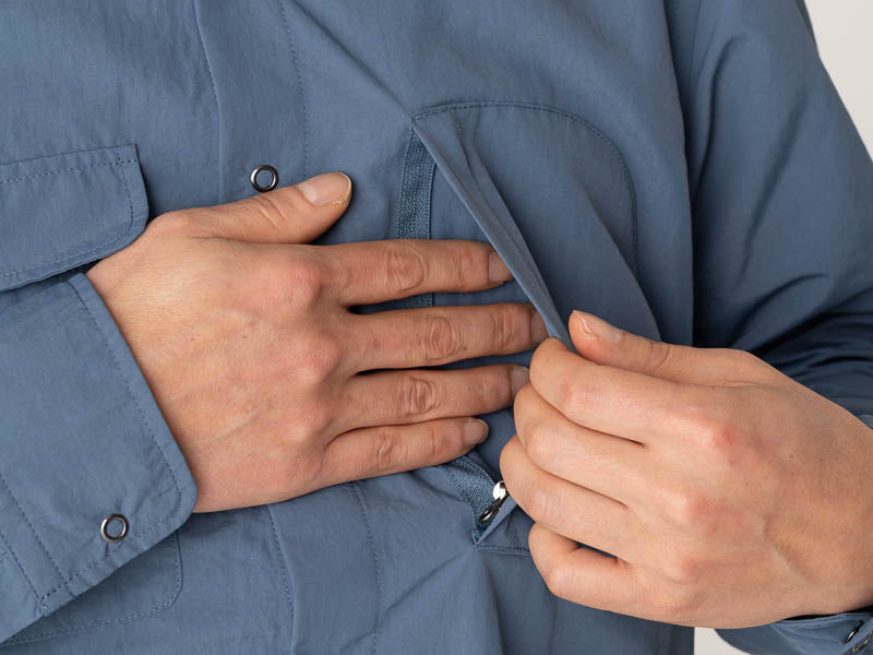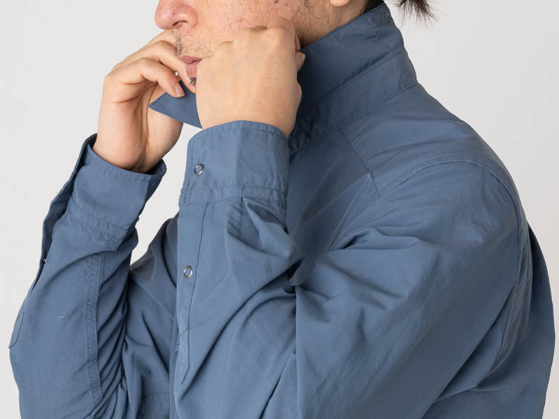 日差しや寒風を遮り、体温の保持や調整に有効なハイキングシャツ。古くからハイカーに愛されてきましたが、一時期は軽さとコンパクトさからウインドジャケットにその座を奪われていました。しかし近年、ナイロン素材の進化とシルエットの吟味がすすみ、ハイキングシャツが再評価されるようになりました。襟や袖を調整することによる温度対応の幅広さはハイキングシャツならでは。さらにニティグリッティシャツはシャツジャケットとして着用することを前提に豊富なポケットを配置しました。ハイキングサコッシュでは歩行中に気になってしまうというハイカーにとってはこのポケットがハイキングサコッシュ替りの収納に役立つはずです。